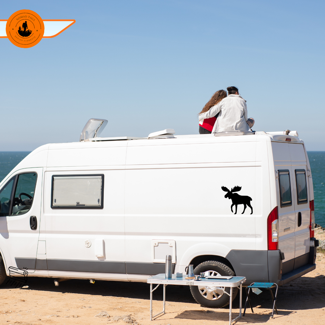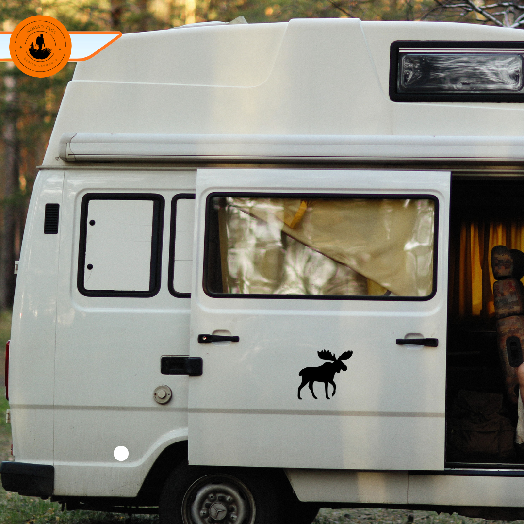 Elch Camper Aufkleber – Minimalistischer Wildlife Vinyl Sticker für Van & Wohnmobil